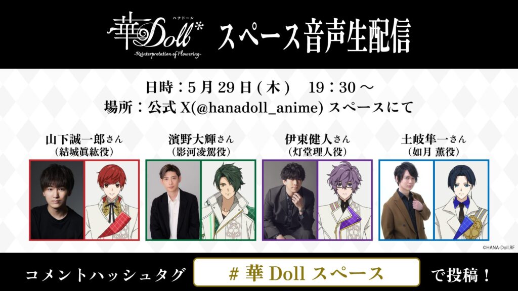 キャスト陣が語るここだけの制作裏話や、今後の展開についてのトークなど、ファン必聴の内容を予定しています! リアルタイムでのコメント参加も大歓迎。ハッシュタグは『#華Dollスペース』です!アニメをさらに楽しめるスペシャルなひとときを、内容盛りだくさんでお届けします!